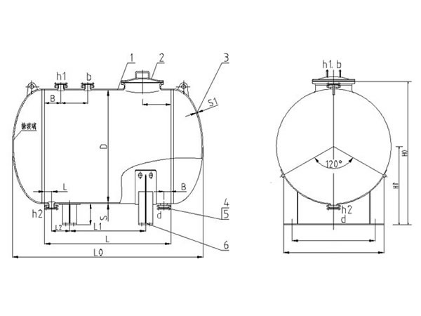 Note: 1 - Tank body, 2 - Glass lined manhole, 3 - Elliptical head, 4 - A type glass lined nozzle, 5 - Lap joint flange, 6 - Saddle support